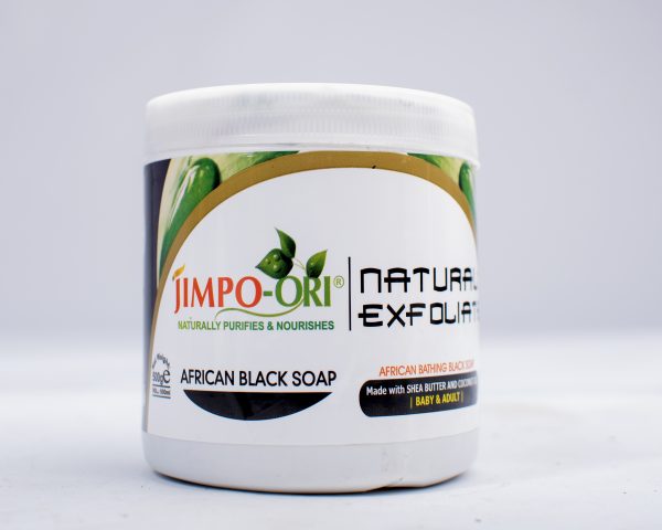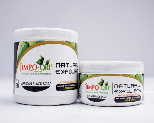 Jimpo-ORI® Natural Exfoliate™ African Black Soap is an Organic Natural Soap produced with African Organic Black Soap formulated for baby’s tender skin and also for adult use. It is produced with a blend of Shea Butter, Aloe Vera Extract, Coconut, Cam-wood extract, and Neem to naturally exfoliate and nourish all kinds of skins. Jimpo-ORI® Natural Exfoliate™ African Black Soap heals all kinds of skin ailments like eczema, and rashes and is also good for the removal of dead, keratinized skin cells sitting on the skin’s surface. This Black Soap leaves the skin smoother and fresher looking and makes it easier for our Jimpo-ORI® Shea Butter Cream products to penetrate the skin’s surface.